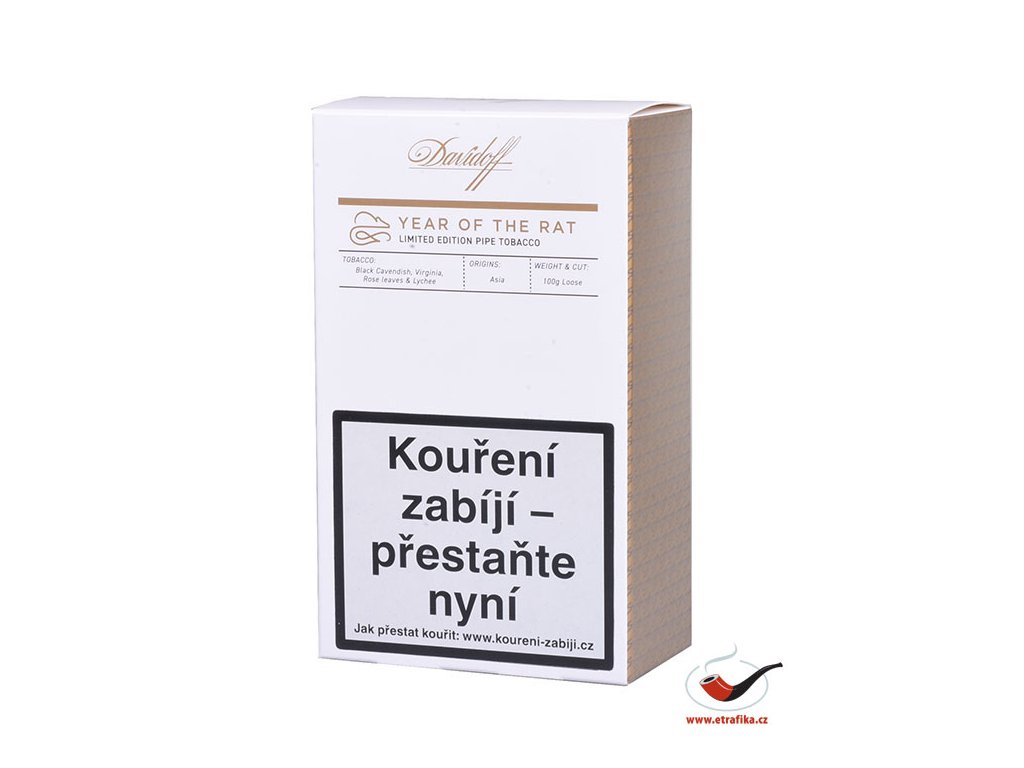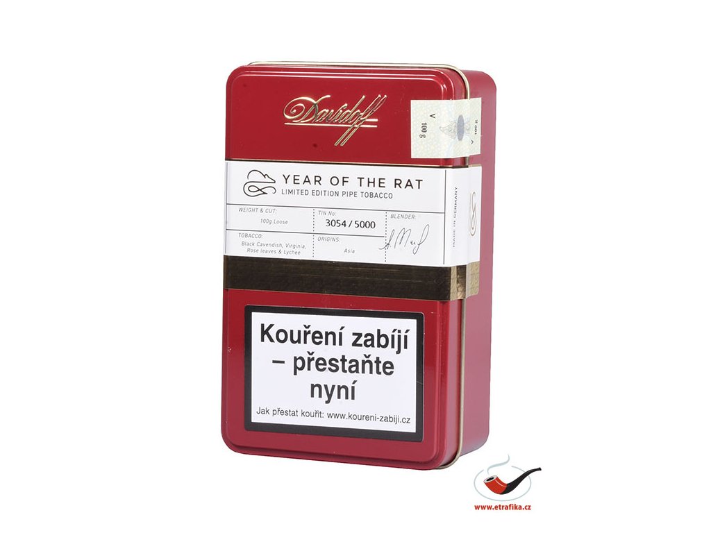 Krysa je prvním znamením dvanáctiletého cyklu čínského zvěrokruhu. Jasní, optimističtí a energičtí, jsou ti, kteří se narodili v roce Krysy. Odměňují ty, kteří je znají a kteří slyší jejich slova. Máte štěstí, pokud s vámi sdílejí svou moudrost, a ještě více, pokud sdílejí možnost ochutnání tohoto vynikajícího dýmkového tabáku Davidoff. Letos poprvé přichází na trh limitovaná edice inspirovaná čínským zvěrokruhem v zářivé červeně lakované dóze se směsí ovlivněnou asijskými příchutěmi, kdy umožňuje milovníkům dýmky vychutnat vyvážené a komplexní chutě směsi suchého ovoce, smetany a liči, jakož i květinové tóny růžových listů. Zakladem jsou tabáky Black Cavendish, Bride Cut Virginia s Dark fired Kentucky.