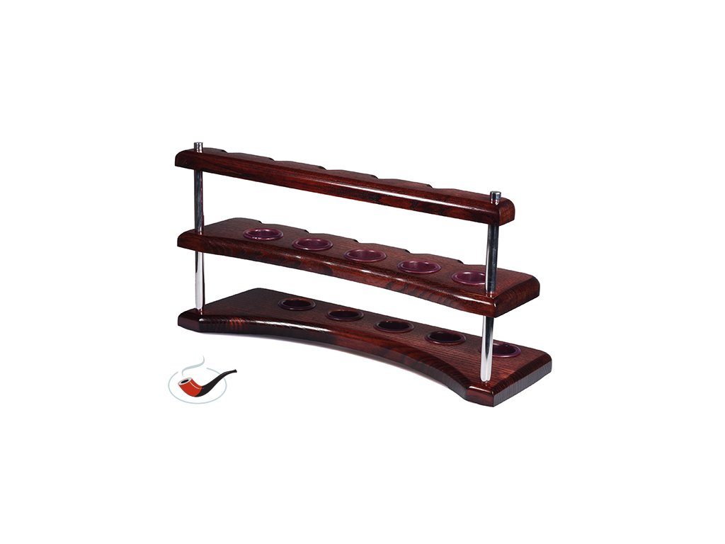 Dřevěný stojánek na 10 dýmek ve tmavě hnědém provedení. Kombinace dřevo-kov-plast